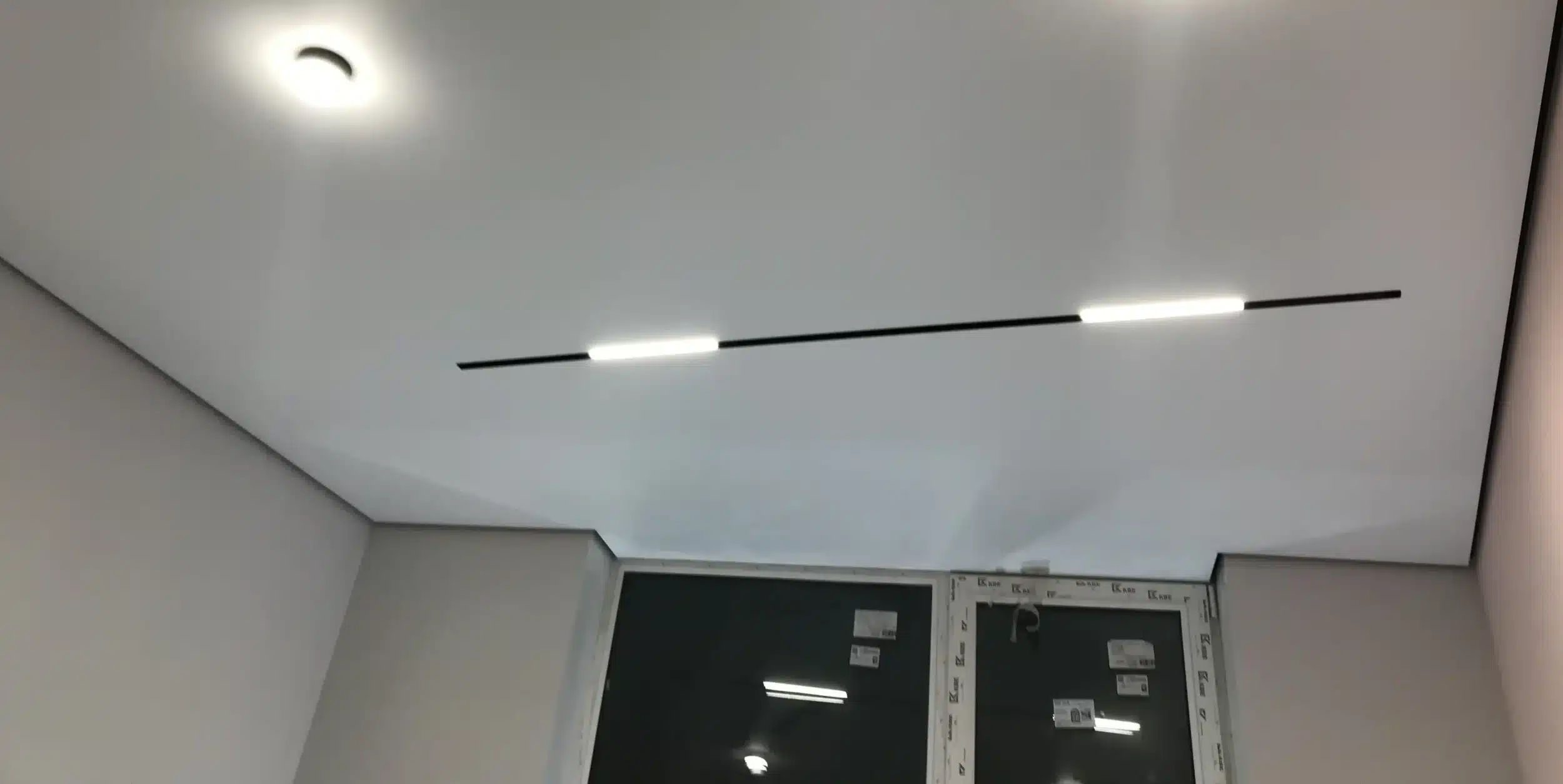 Натяжна стеля в кухні обеднаною з коридором 25 м²Біла матова стеля з світовими лініями та вбудованим магнітним трекомПлоща 25 м²Полотно MSD PremiumПрофіль ТіньовийОсвітлення: Світлова лінія та магнітний трекДоп. Магнітний дифузор -