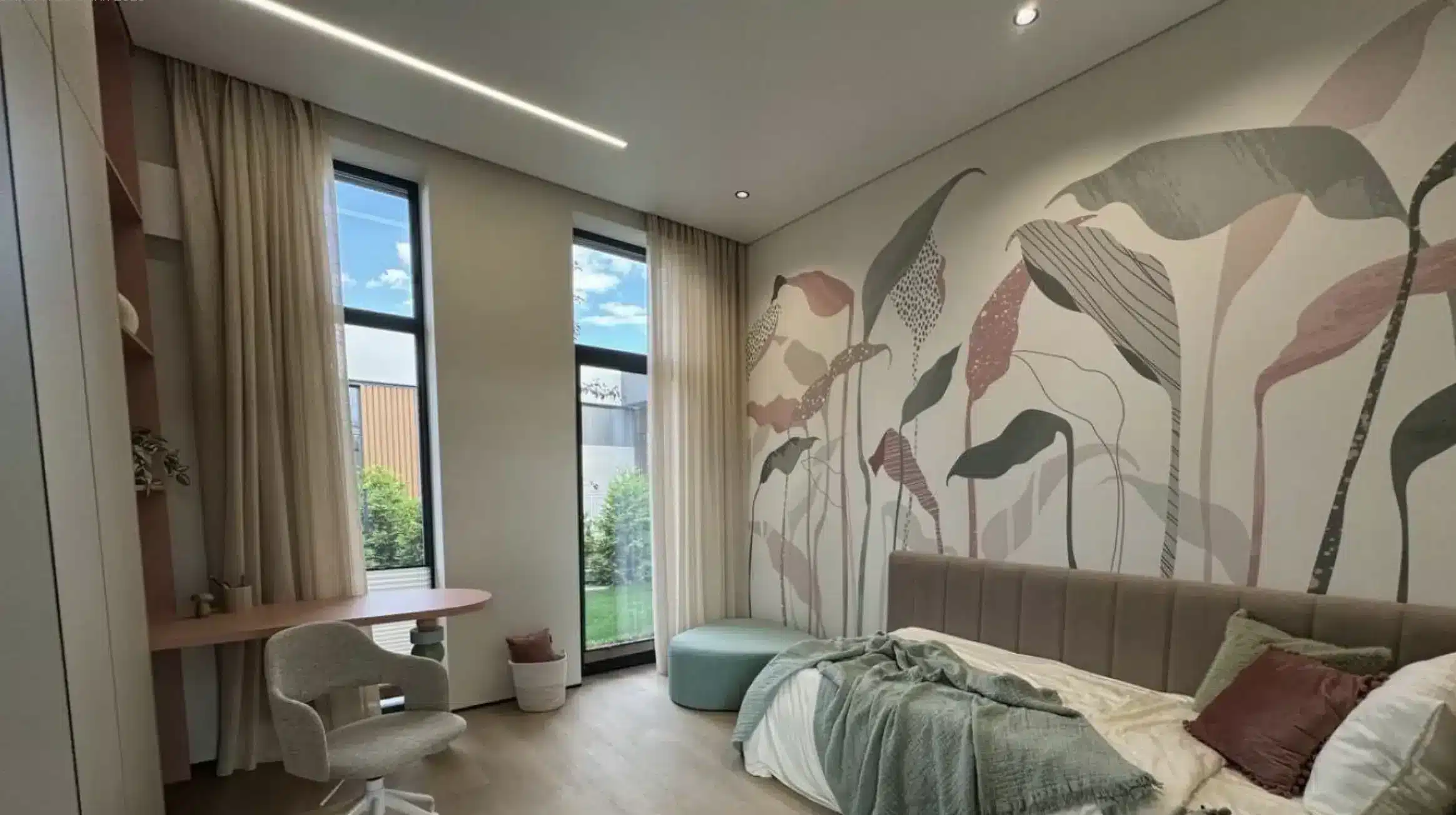Натяжна стеля в дитячій кімнаті 12 м²Білий сатин з тіньовим профілем,світовою лініею над столом, точковими світильниками та нішею під карнизПлоща: 12 м²Полотно матовe MSD PremiumПрофіль ТіньовийОсвітлення Світлова лінія та врізні світильникиДоп. Ніша під карніз -
