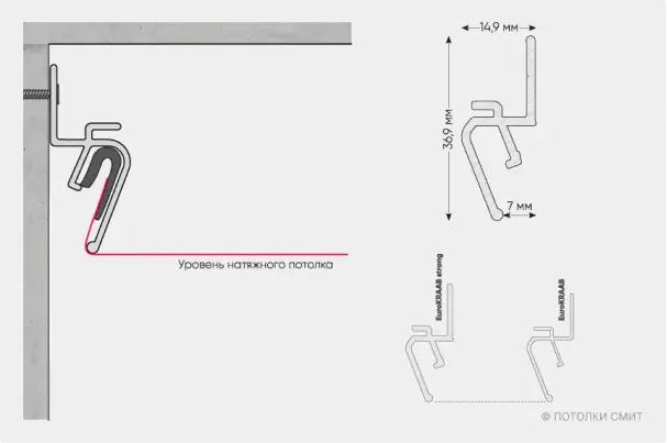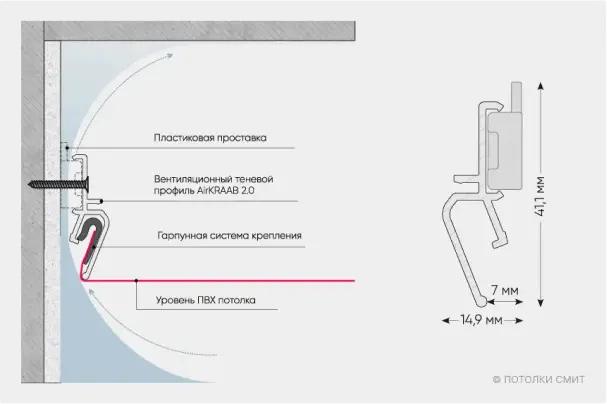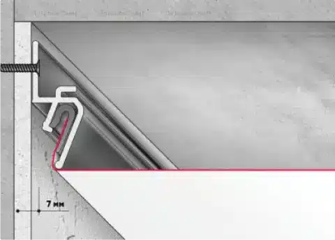 У процесі роботи з тіньовими стелями є один момент, що потребує обережності та професійних навичок. На кутах профіль підрізається. Коли профіль обганяє кут стіни, через нахил «полиці» виникає гострий клин, що може порвати полотно.