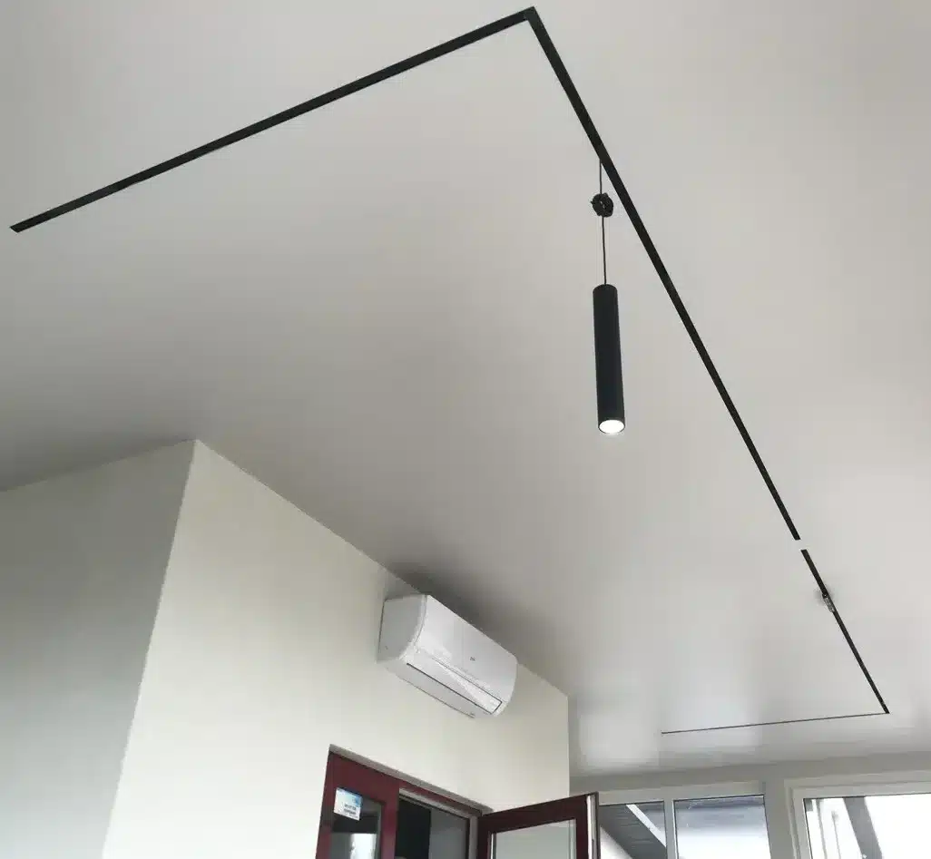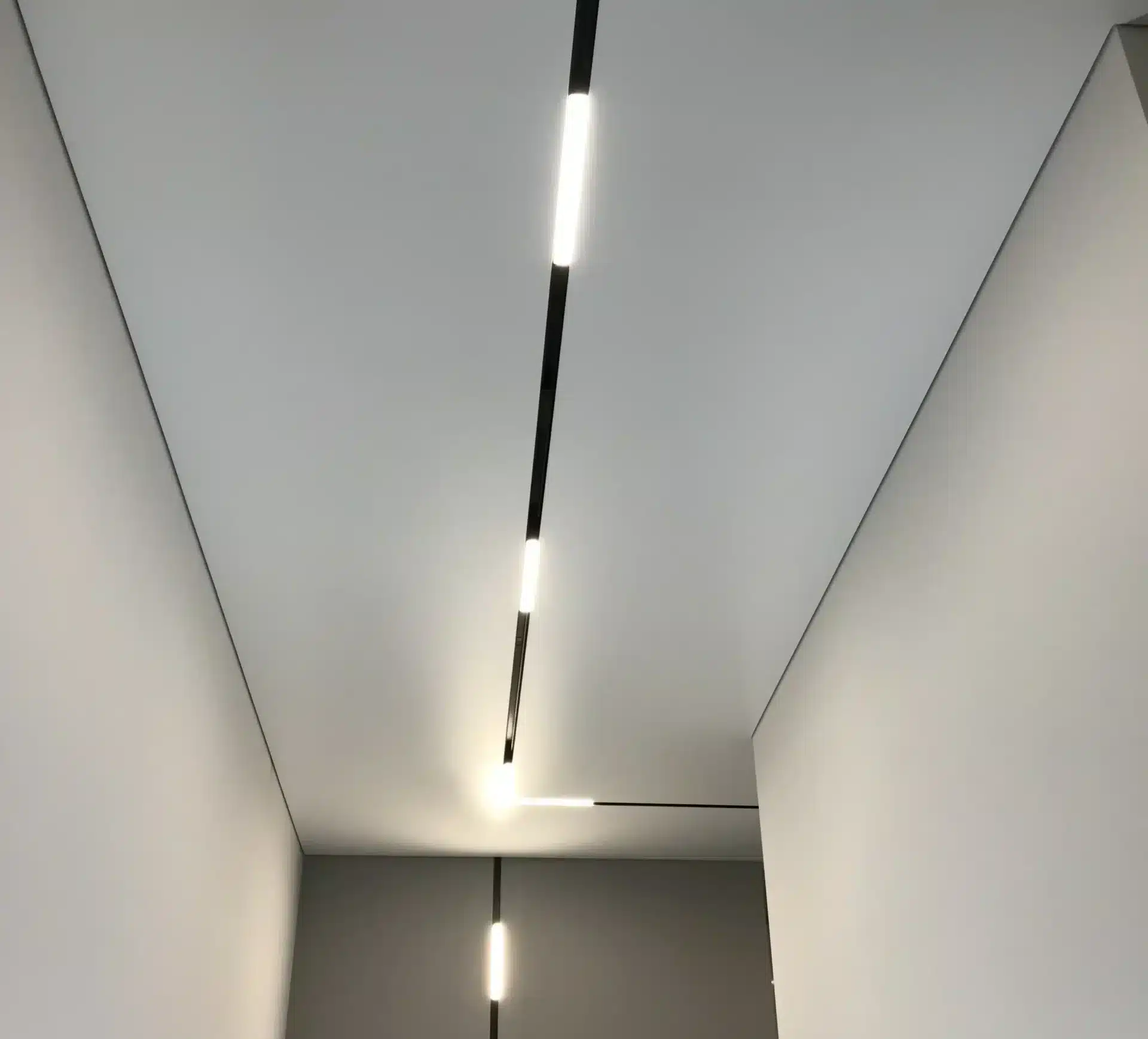 Натяжной потолок в коридоре 8 м²Биловый матовый потолок с теневым зазором по периметру и встроенным магнитным трекомПлощадь 8 м²Полотно TeqtumПрофиль ТеневойОсвещение Магнитный трекДоп. Магнитный диффузор -