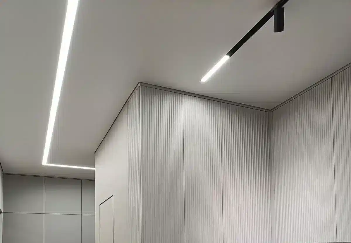 Натяжной потолок в кухне объединенной с коридором 25 м²Белый матовый потолок с мировыми линиями и встроенным магнитным трекомПлощадь 25 м²Полотно TeqtumПрофиль ТеневойОсвещение Световая линия и магнитный трекДоп. Магнитный диффузор